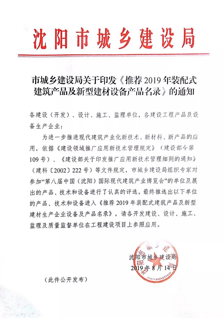 2019814日,沈陽市城鄉(xiāng)建設局發(fā)布《推薦2019年裝配式建筑產(chǎn)品及新型建材設備產(chǎn)品名錄》,我公司雙腹扳H型鋼結構梁、箱式集成房、開放式金屬幕墻等產(chǎn)品成功入選。