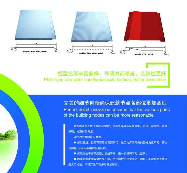 SX-400幕墻板創(chuàng)新的節(jié)點(diǎn)結(jié)構(gòu),獨(dú)特的安裝方式,確保外墻的墻面、墻角全無釘。使用三新工業(yè)金屬幕墻板建筑外墻,整潔、美觀,可以達(dá)到理想的建筑表面裝飾效果??茖W(xué)嚴(yán)謹(jǐn)?shù)捻椖抗芾砉ぷ魇谴_保工程安裝能真實地符合三新集團(tuán)金屬建筑系統(tǒng)技術(shù)體系要求的根本保障。